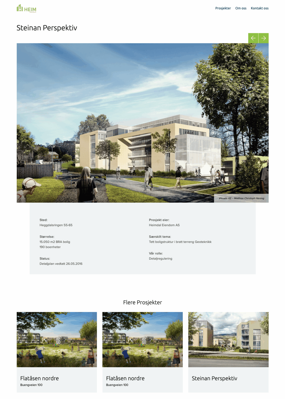 På nettsiden presenteres de ulike eiendoms-prosjektene som Heim Eiendom er involvert i, som partner, byggherre og utvikler.